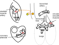 The model shows relaxation of the circular smooth muscle in the bronchial tree is due to epinephrine -- note the lack of innervation at this location thus NE is not indicated. Beta 2 receptors are also on small coronary arterioles thus increasing hormonally induced blood flow within the musculature of the heart. These receptors are the primary receptor in skeletal muscles arteries resulting in enhanced blood flow especially when epinephrine is present.