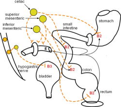 The jejunum and ileum are innervated by postganglionic axons (dashed orange line) originating in the celiac ganglion. The colon (large intestine) is innervated by neurons from the superior mesenteric ganglion while in the rectum they originate in the inferior mesenteric ganglion. Norepinephrine is released from these to binds with beta 2 receptors on the smooth muscle layers to decrease their motility. Additionally, neurons from the inferior mesenteric also innervate the internal anal and urethral sphincters releasing norepinephrine on alpha 1 receptors causing increased tone in those tissues.