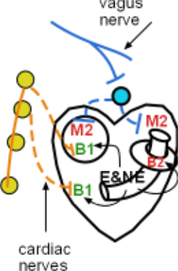 Inotropism refers to a change in force ... in this case, the force of contraction. Cardiac muscle cells of both the atria and ventricles have beta 1 receptors. Norepinephrine released from postganglionic neurons (dashed orange lines) binds to these receptors resulting in increased contractile force. Here, too, the preganglionic neurons arise from the thoracic cord and travel upward through the chain to the cervical ganglia.